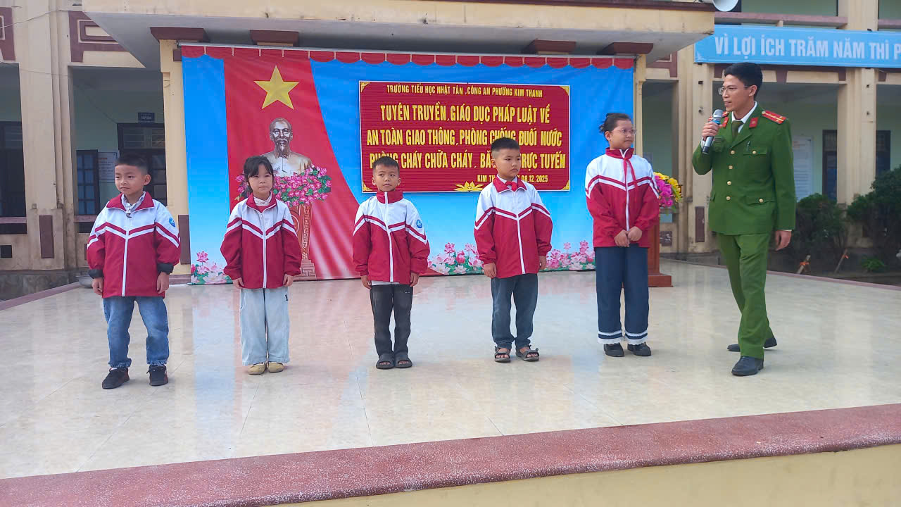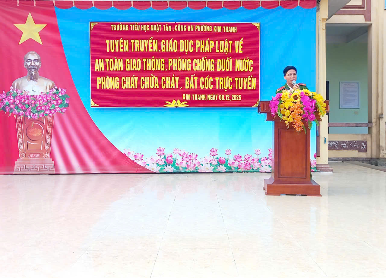 Nhằm nâng cao nhận thức và trang bị cho học sinh những kiến thức, kỹ năng cần thiết về an toàn trong cuộc sống hằng ngày, sáng ngày 08 tháng 12 năm 2025, Trường Tiểu học Nhật Tân phối hợp cùng Công an phường Kim Thanh tổ chức buổi tuyên truyền pháp luật với các nội dung: An toàn giao thông, Phòng chống đuối nước, Phòng cháy chữa cháy và Phòng chống bạo lực học đường cho toàn thể học sinh nhà trường.