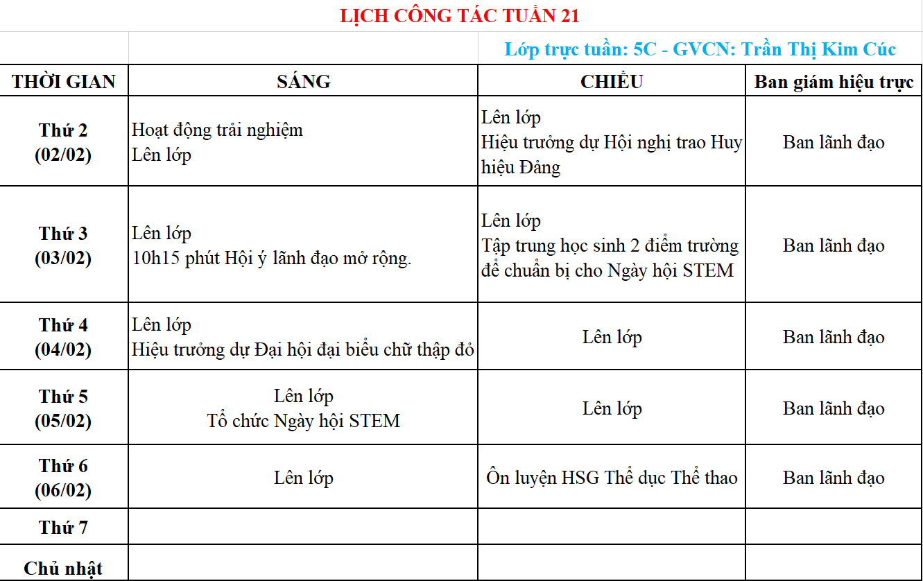 LỊCH CÔNG TÁC TUẦN 21
