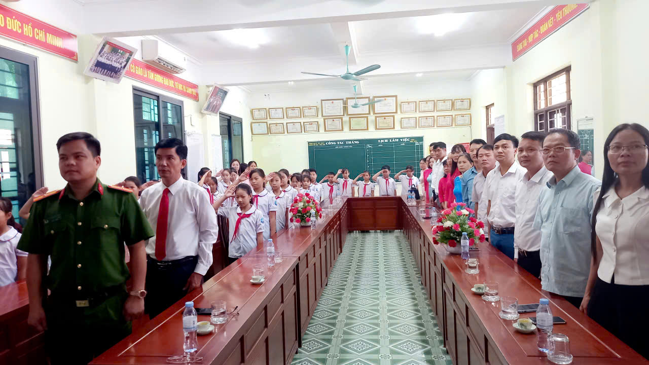 Ngay từ sáng sớm, sân trường đã rộn ràng sắc màu cờ hoa, tiếng trống, tiếng cười nói hân hoan của các em học sinh. Lễ khai giảng được tổ chức trang nghiêm nhưng ấm áp, với sự tham dự của các vị đại biểu địa phương, ban phụ huynh, giáo viên và toàn thể học sinh. Những gương mặt rạng rỡ, háo hức của các em nhỏ lần đầu tiên bước vào mái trường tiểu học đã làm bừng sáng không gian khai giảng.