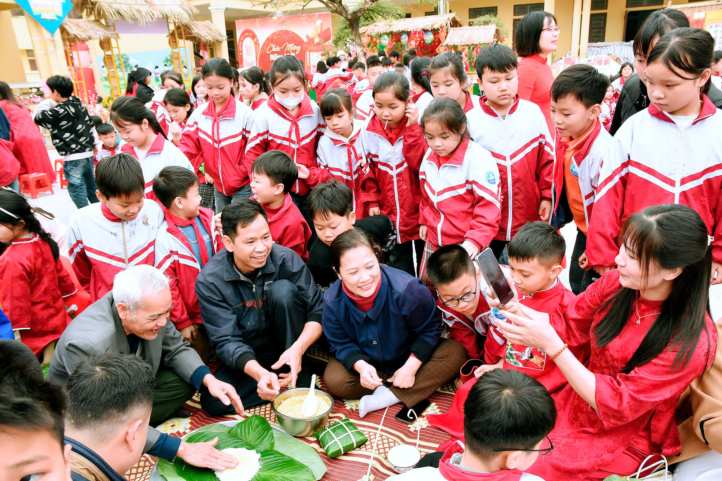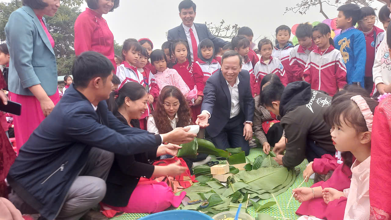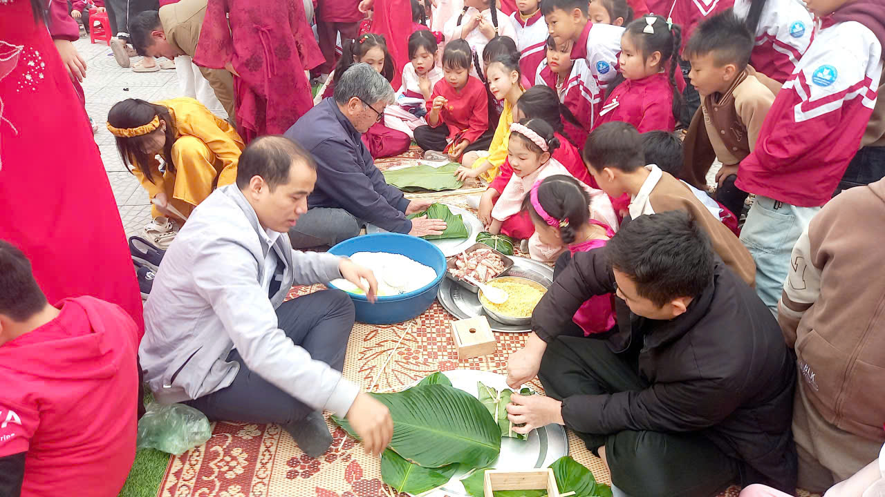 2. Trải nghiệm gói bánh chưng và viết thư pháp: Tại khu vực trải nghiệm văn hóa, các em học sinh được các bậc phụ huynh, ông bà hướng dẫn tận tay gói những chiếc bánh chưng xanh vuông vắn. Bên cạnh đó, hoạt động xin chữ tại gian hàng Thư pháp cũng thu hút đông đảo học sinh tham gia, giúp các em hiểu thêm về tục lệ tốt đẹp đầu năm của người Việt.