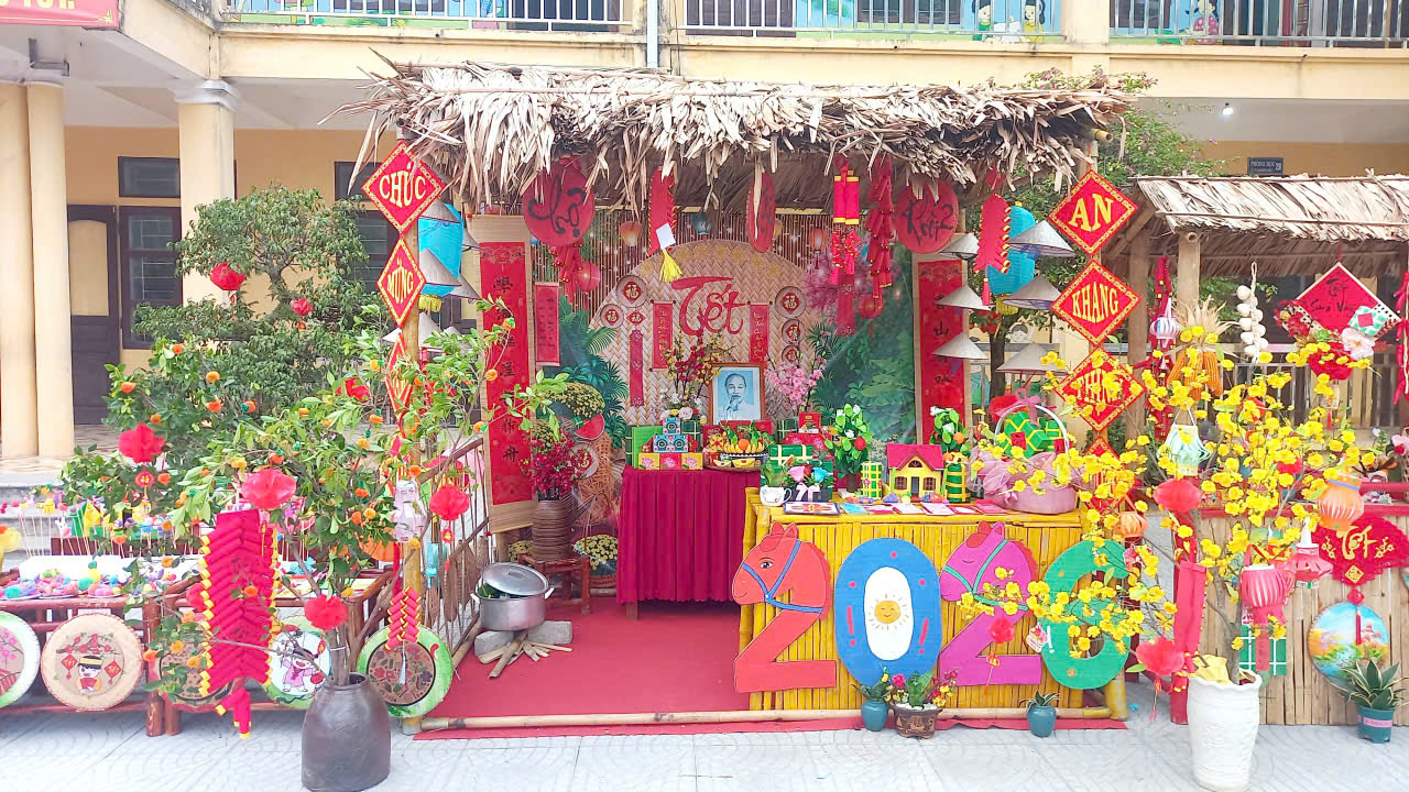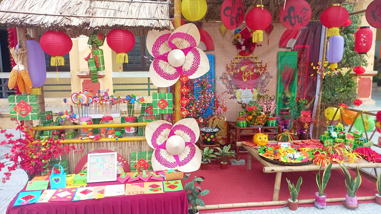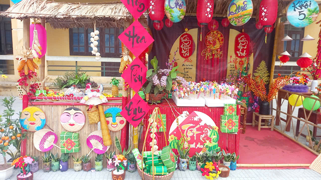 1. Trưng bày gian hàng Tết của 5 khối lớp: Dưới bàn tay khéo léo của các em học sinh cùng sự hỗ trợ của thầy cô và phụ huynh, 5 gian hàng đại diện cho 5 khối lớp đã tái hiện lại không gian chợ Tết xưa đầy màu sắc. Các sản phẩm STEAM sáng tạo, những vật dụng trang trí Tết được bày biện đẹp mắt, thể hiện tư duy thẩm mỹ và khả năng sáng tạo không giới hạn của các em.