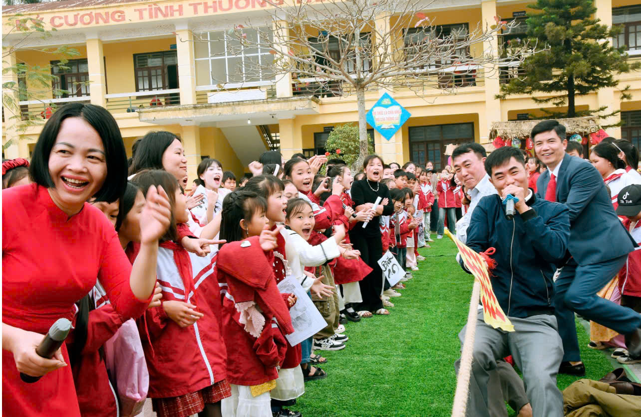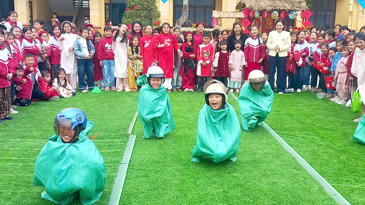 3. Trò chơi dân gian: Không khí ngày hội càng thêm náo nhiệt với các trò chơi dân gian. Tiếng hò reo cổ vũ vang dội khắp sân trường khi các em tham gia kéo co, ném vòng, nhảy bao bố, phi tiêu… Đây là cơ hội để các em rèn luyện sức khỏe, tinh thần đoàn kết và sự nhanh nhẹn.